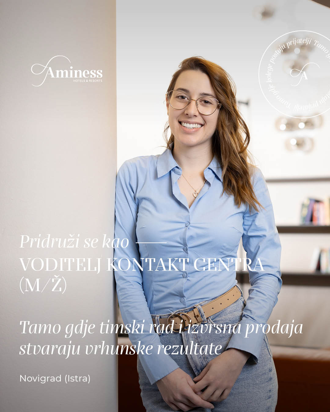 Aminess Hotels&Resorts traži odgovornu i proaktivnu osobu s iskustvom u prodaji za poziciju Voditelja kontakt centra (m/ž). Pridružite se našem timu i budite ključna karika u direktnoj prodaji i razvoju izvrsnog korisničkog iskustva.