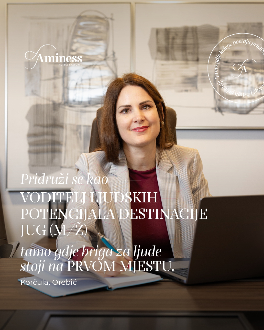 Tražite uzbudljivu i dinamičnu karijeru u turizmu? Aminess Hotels & Resorts, najbrže rastuća turistička kompanija u Hrvatskoj, sa svojih 16 hotela, 5 kampova i 3 resorta s vilama i apartmanima, nudi vam savršenu priliku da nam se pridružite i stvorite nove poslovne veze koje traju.